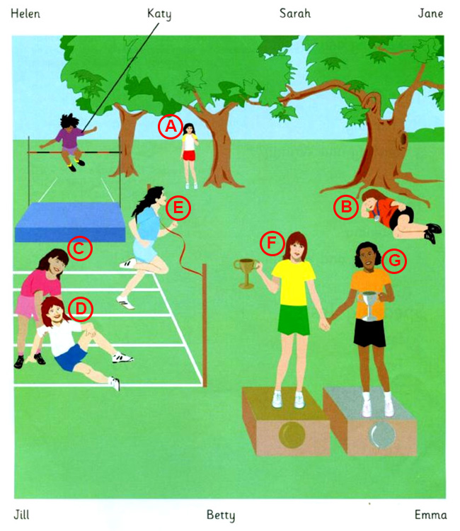 Describing People – A2 English Listening Test Listening » A2 Listening Tests » Describing People – A2 English Listening Test A2 Listening Test Tests: 123456 Look at the picture. Listen and choose the correct people. There is one example. https://testenglishonline.com/wp-content/uploads/2023/a2/flyers/a2-listening-to-describing-people-4.mp3 0 KatyShe’s jumping very high. 1 HelenJillBettySarahJaneEmma -- FBAECDG 2 JaneSarahBettyEmmaJillHelen -- EFGCABD 3 HelenJillBettyJaneEmmaSarah -- ADGBECF 4 JaneEmmaBettySarahJillHelen -- FGECABD 5 JillJaneHelenEmmaSarahBetty -- BCAFGED Loading... Tests: 123456